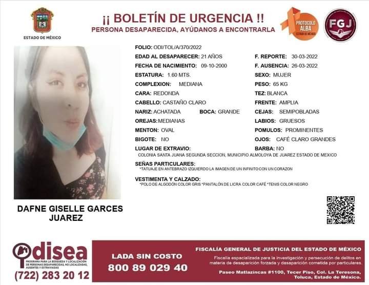 Según la cédula Odisea generada por la Fiscalía de Personas Desaparecidas, Extraviadas y No Localizadas con el folio ODI/TOL/A/370/2022, tiene como señas particulares un tatuaje en el antebrazo izquierdo, además de vestir un polo de algodón de color gris, pantalón de licra café y unos tenis de color negro.