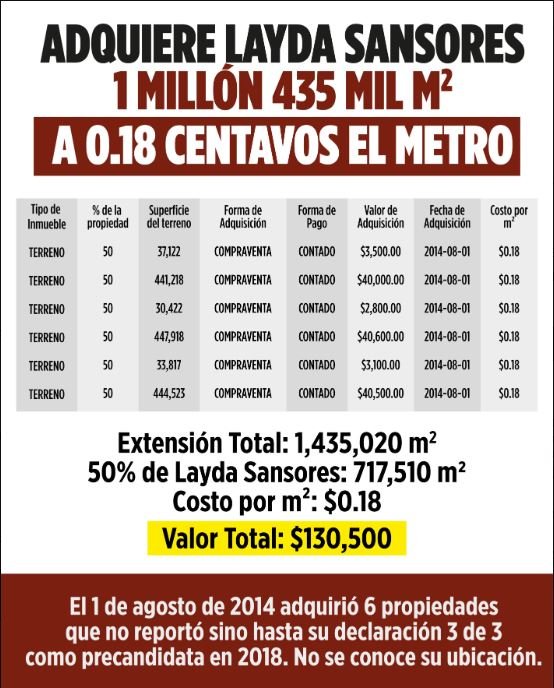 “Extensión total un millón 433 mil 020 metros, 50 por ciento de Layda Sansores: 715 mil 510 metros con un costo de metro cuadrado por 0.18 pesos, y un valor total de 130 mil 500 pesos. Adquirió del 1 de agosto de 2024, seis propiedades que no reportó sino hasta su declaración 3 de 3 como precandidata en 2018. No se conoce su ubicación”, indicó el líder priista.