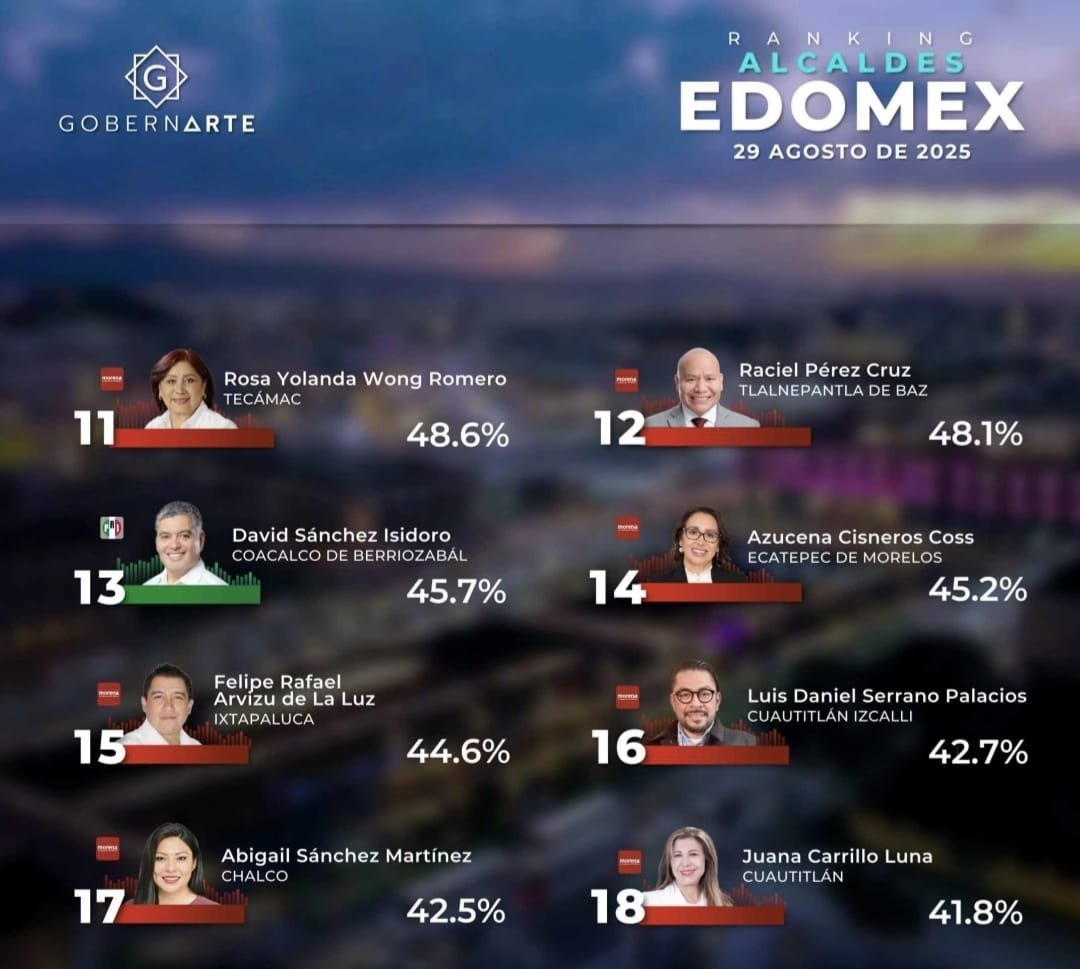 La alcaldesa Abigail Sánchez Martínez, de Chalco, obtuvo apenas 42.5 por ciento de aprobación ciudadana y se ubicó en el lugar 17 de 18 en el ranking estatal de Gobernarte S.C., publicado el 29 de agosto. Vecinos de Chalco afirman que el gobierno municipal no ha respondido a las necesidades básicas de la población y piden resultados inmediatos.