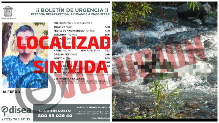 Alfredo de 24 años de edad fue localizado sin vida en un río en Malinalco después de haber sido reportado como desaparecido desde hace tres días.