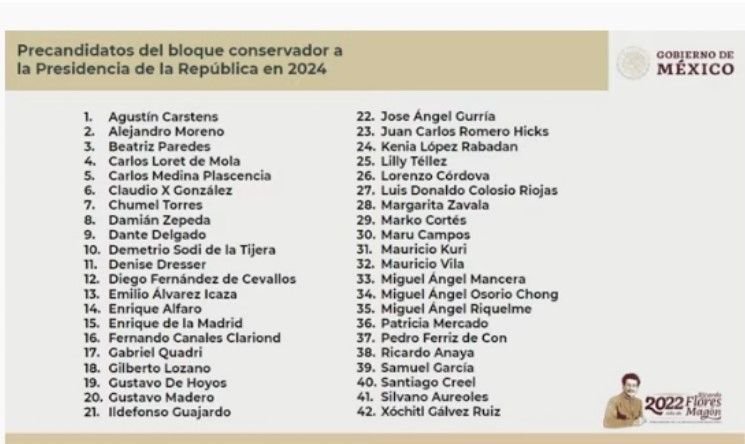 El presidente Andrés Manuel López Obrador dio a conocer este jueves una lista con 43 nombres que, de acuerdo con él, serían los posibles candidatos del bloque conservador a la Presidencia de México para las elecciones de 2024, entre los que destaca comediantes y periodistas.