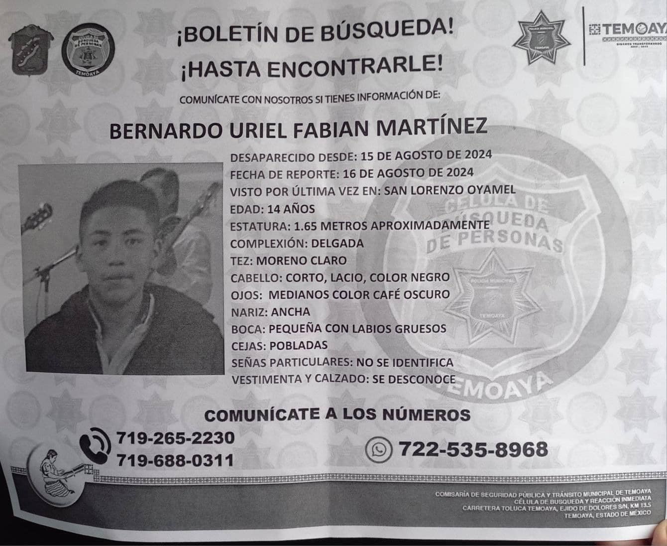 Familiares de Bernardo Uriel Fabián Martínez, quien desapareció el jueves 15 de agosto en el municipio de Temoaya, piden a la ciudadanía colaborar para ayudar a la pronta localización del adolescente de 14 años, por ello solicitan se unan a una brigada de búsqueda.