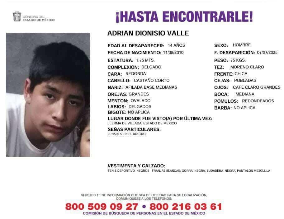 Indican que salió de su casa alrededor de las 9:00 p.m., en la localidad de Pueblo Nuevo, municipio de Lerma y ya no se supo nada de él. De acuerdo con la ficha de búsqueda, el menor es de tez morena clara, tiene los ojos café claro grandes, cabello castaño corto y es de complexión delgada.