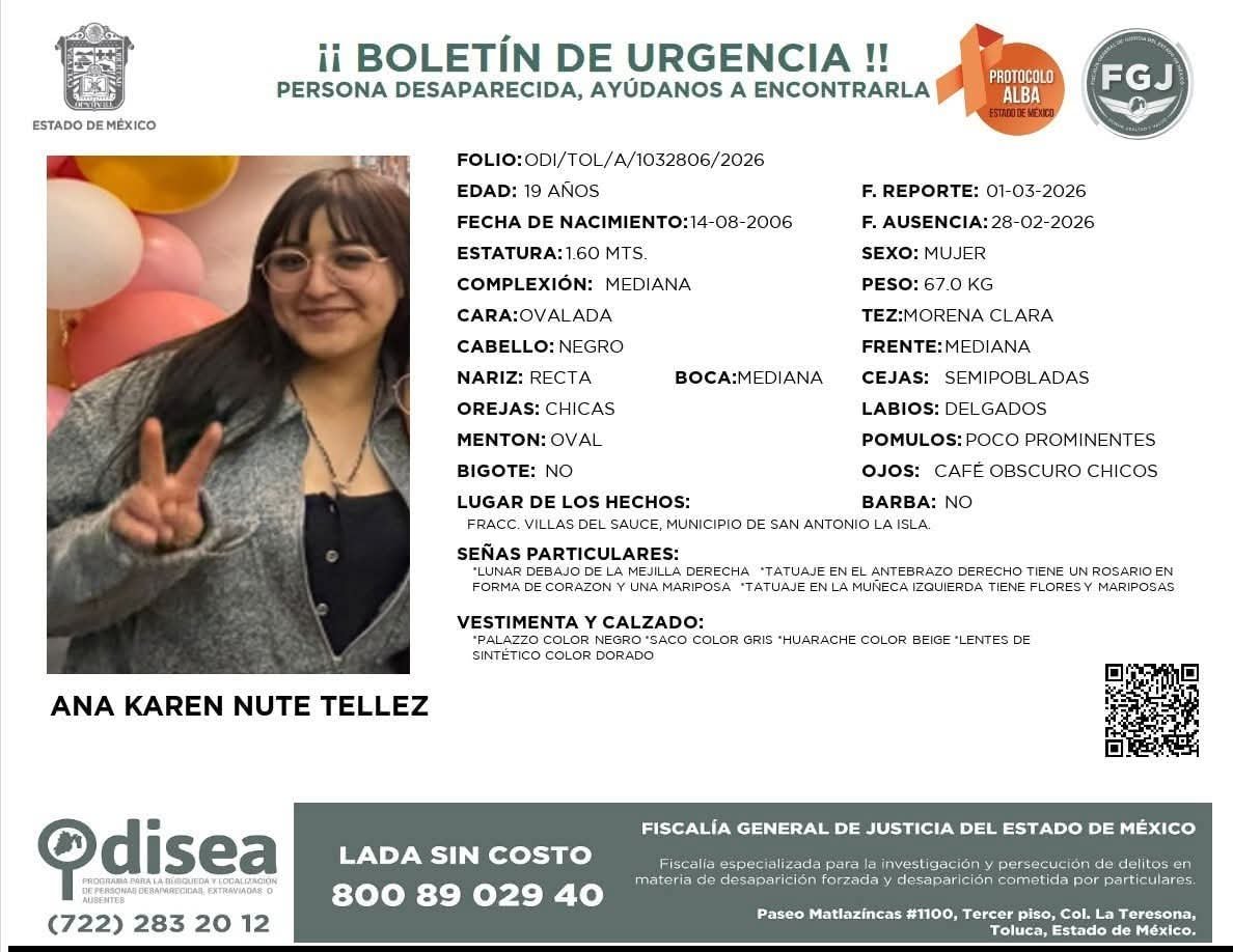 La comunidad de San Antonio la Isla se encuentra en máxima alerta tras la desaparición de Ana Karen Nute Téllez, una joven de 19 años de quien se perdió el rastro la noche del pasado sábado.