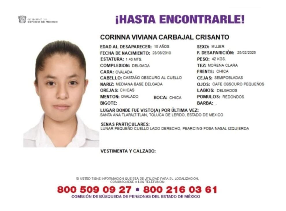 Las autoridades del Estado de México han emitido una ficha de búsqueda urgente para localizar a Corinna Viviana Carbajal Crisanto, una adolescente de 15 años que fue vista por última vez el pasado 25 de febrero de 2026 en la localidad de Santa Ana Tlapaltitlán, perteneciente al municipio de Toluca.