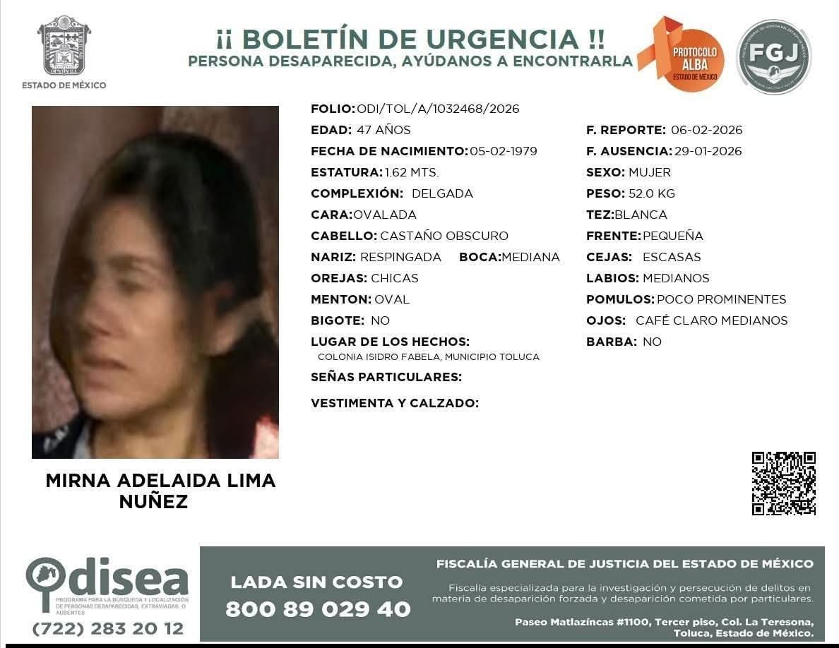 Se hace un llamado urgente a la población para que en caso de contar con cualquier dato que facilite su ubicación, se comunique a las líneas de emergencia o a las oficinas de la Fiscalía, con el fin de coordinar esfuerzos de localización entre las autoridades mexiquenses y las del estado de Guerrero.