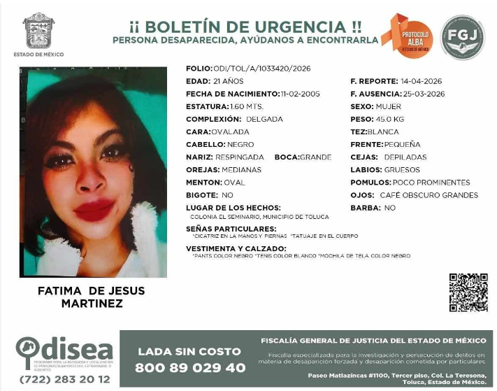 Buscan a Fátima de Jesús tras ser reportada como desaparecida en Toluca