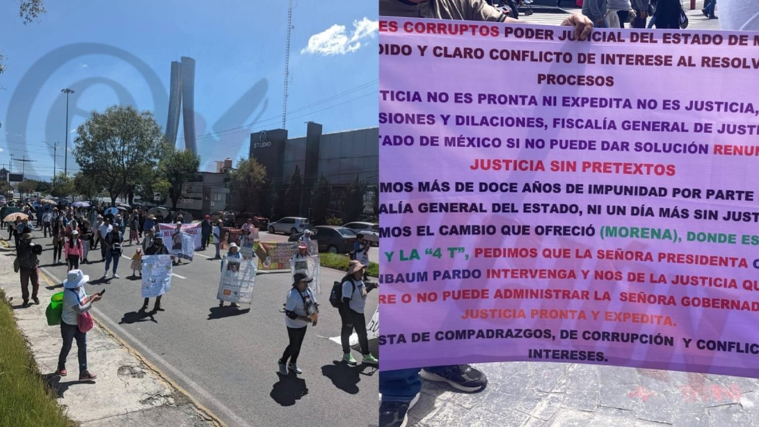“Jueces corruptos, Poder Judicial del Estado de México vendido y claro conflicto de intereses al recorvar sus procesos. La Justicia no es pronta ni expedita, no es justica. Ya basta de omisiones”; se lee en una de sus pancartas con las que se manifiestan, a la par piden al fiscal del Estado de México, que si no pueden dar soluciones, que renuncie al cargo.