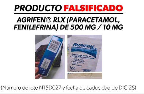 La Comisión Federal para la Protección contra Riesgos Sanitarios (Cofepris) lanzó una nueva advertencia de la falsificación del medicamento AGRIFEN RLX, que combina paracetamol y fenilefrina, en su presentación de 500 mg / 10 mg granulado, en caja con cinco sobres.