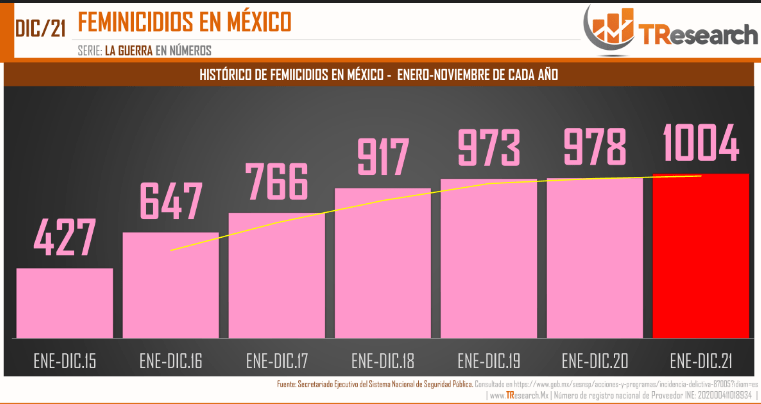 De acuerdo con la encuestadora y analista Research, en su trabajo “La Guerra en Números” ese aumento sólo en el periodo de lo que va del sexenio de AMLO los feminicidios aumentaron en un 109.85 por ciento, basándose en los datos presentados por la misma Secretariado Ejecutivo del Sistema Nacional de Seguridad Pública (SESNSP).