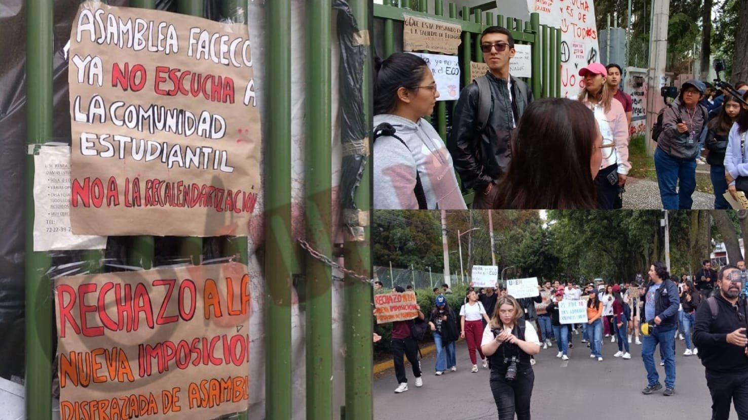 Estudiantes de la Facultad de Economía realizaron una marcha en las inmediaciones de Ciudad Universitaria (CU) para solicitar a los paristas del Enjambre Estudiantil Unificado (EEU) y a la Asamblea Estudiantil que se liberen las instalaciones para retomar las clases presenciales.