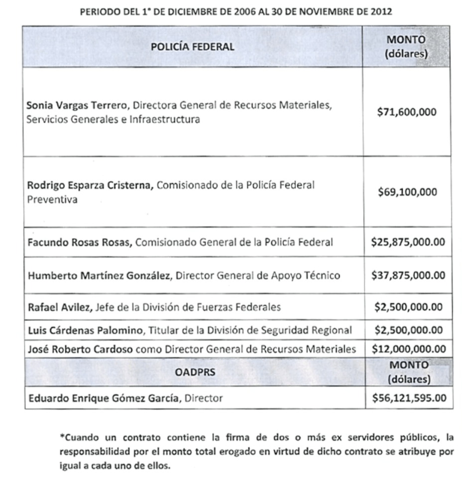 Sostuvo que dicha lista de los exfuncionarios implicados en la firma de contratos millonarios como parte de la extinta Policía Federal, se realizaron durante los sexenios de Felipe Calderón y Enrique Peña Nieto, principalmente para sistema de rastreos y localización y sistema Safe City.