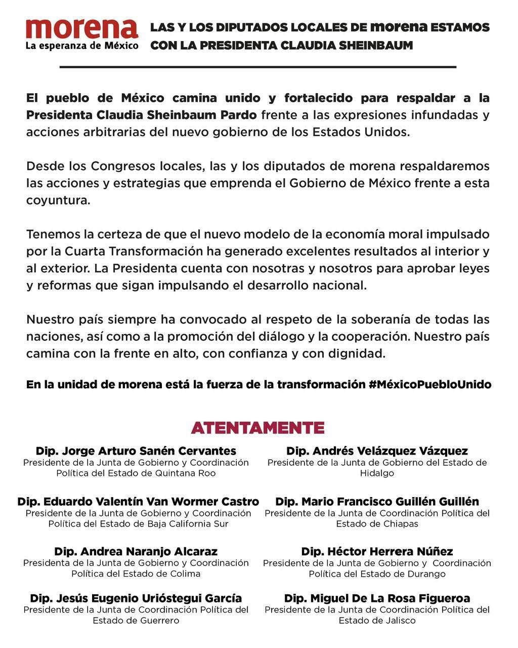 Vázquez Rodríguez, quien también preside la Junta de Coordinación Política, máximo órgano de decisión de la Cámara de Diputados estatal, precisó que al igual que los congresistas de morena de todo el país, el pueblo mexiquense y mexicano camina unido y fortalecido para respaldar a la presidenta de México frente a las expresiones infundadas y acciones arbitrarias del nuevo gobierno de los Estados Unidos.