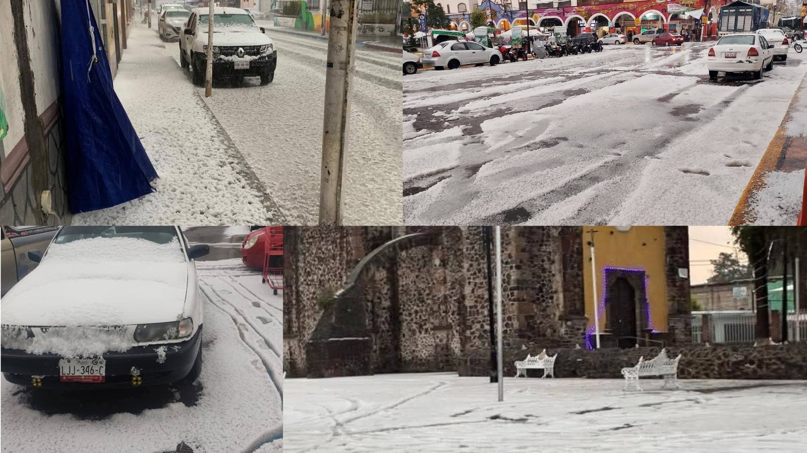 Vecinos documentaron cómo el granizo “pintó de blanco” diversas calles del municipio, generando postales inusuales y, al mismo tiempo, complicaciones para el tránsito vehicular y peatonal.