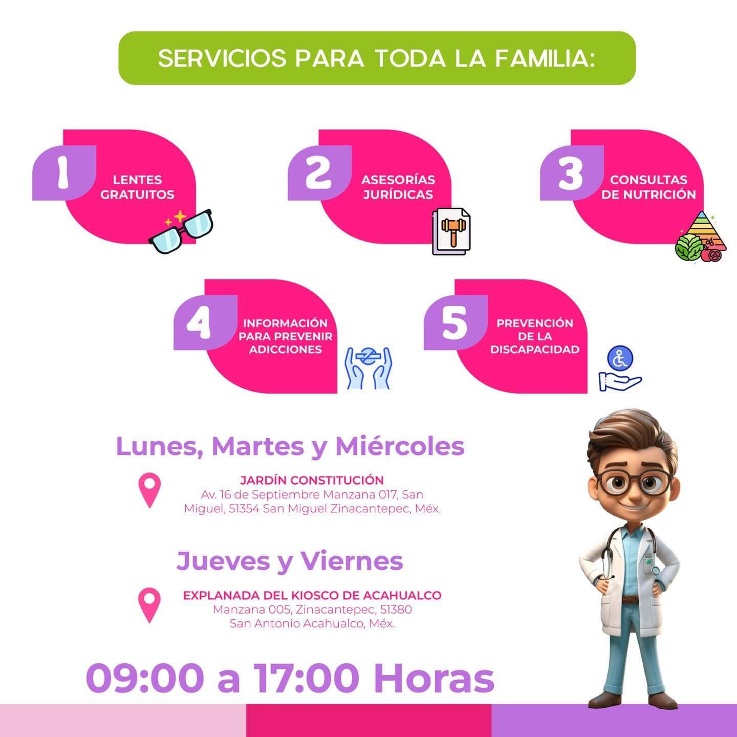 Los servicios para toda la familia son lentes gratuitos, asesorías jurídicas, consultas de nutrición, información de prevenir adicciones, prevención de la discapacidad; así que ¡no puedes pasar esta gran oportunidad!, solo necesitas llevar tu identificación oficial, es decir, tu INE.
