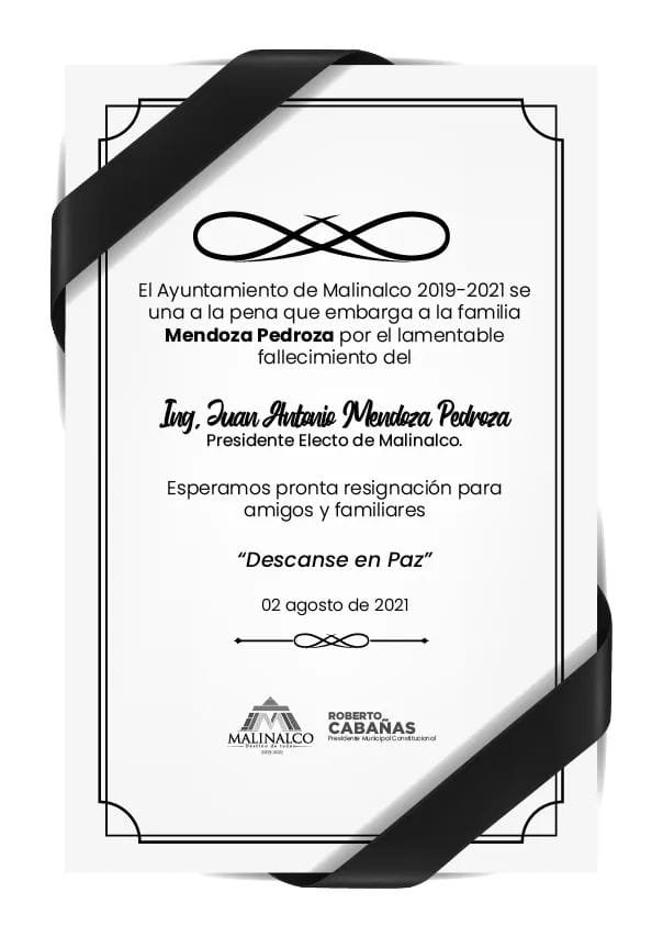 El alcalde electo del municipio de Malinalco por el Partido Verde Ecologista del Estado de México (PVEM), Juan Antonio Mendoza Pedroza, falleció este lunes víctima de COVID- 19.