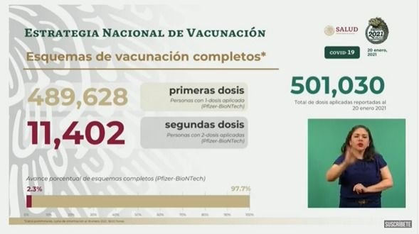 Referente al proceso de vacunación hasta este miércoles fueron aplicadas 501 mil 30 dosis entre el personal de salud de país, 489 mil 628 de la primera dosis y 11 mil 402 personas ya recibieron la segunda aplicación.