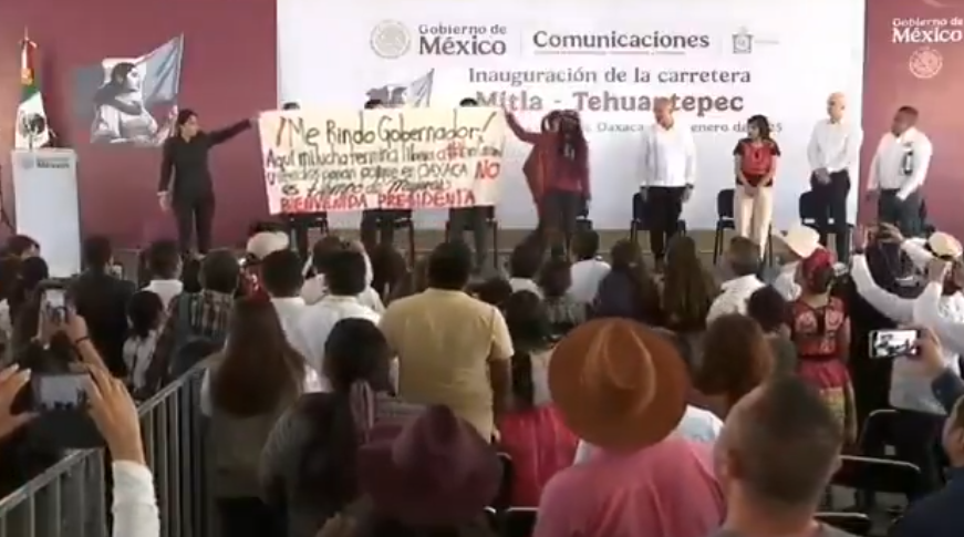 En el video, que ya ha comenzado a ser viral, puede verse como la presidenta termina de dirigir un mensaje por la inauguración de la carretera Mitla-Tehuantepec en San Pablo Villa de Mitla, Oaxaca y la activista llega a meterse al podio para acusar que en Oaxaca y con Sheinbaum no ha tenido acceso a la justicia.
