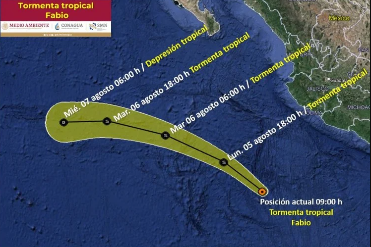 Se pronostica que el miércoles 7 de agosto baje de tormenta a depresión tropical, siguiendo una trayectoria hacia el noroeste y adentrándose en el océano Pacífico, alejándose de las costas mexicanas. Fabio es la quinta tormenta tropical formada en el Pacífico.
