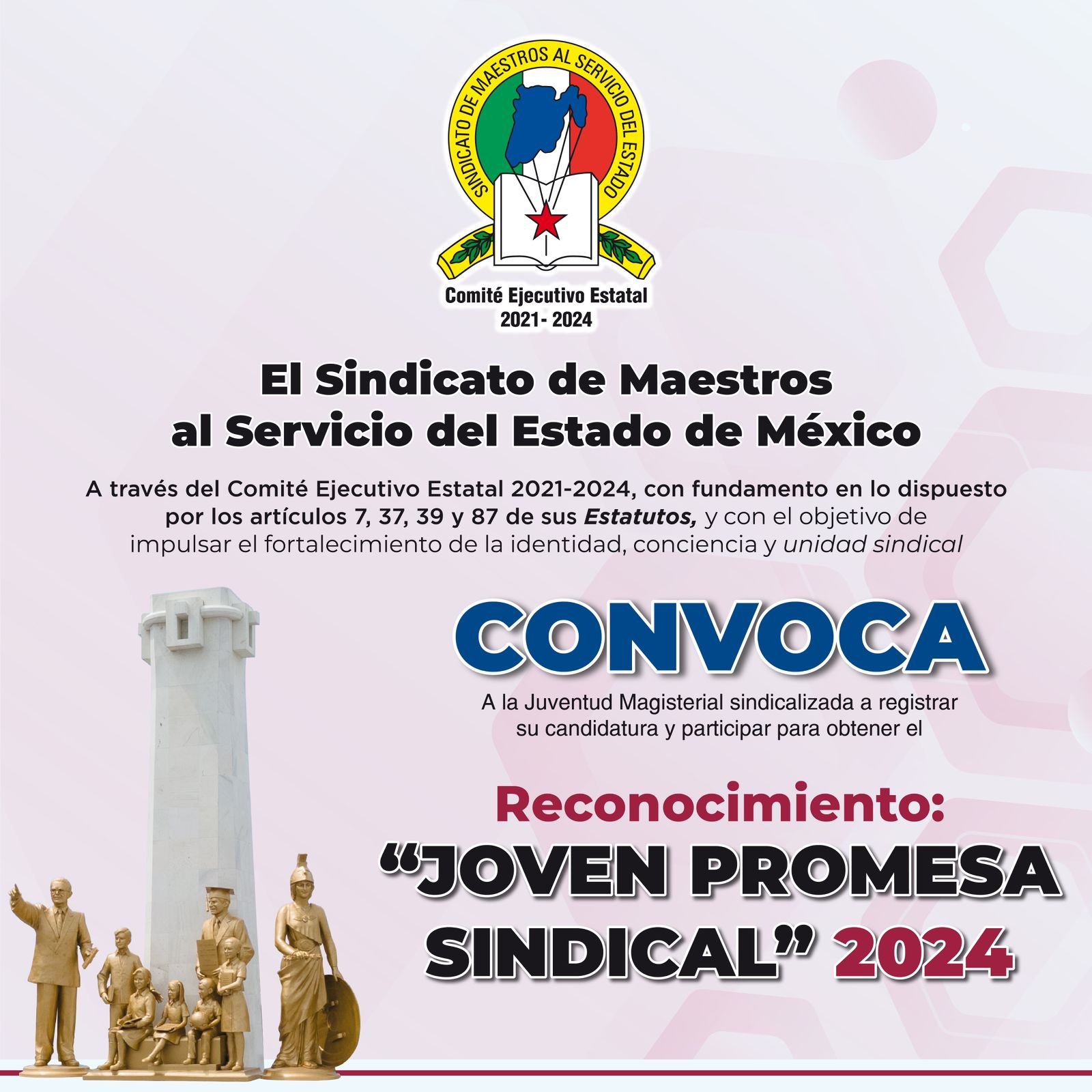 El Sindicato de Maestros al Servicio del Estado de México (SMSEM), que dirige Marco Aurelio Carbajal Leyva, secretario general, emitió la convocatoria para el reconocimiento “Joven Promesa Sindical” 2024, dirigido a docentes afiliados menores de 35 años. Este premio, que forma parte de la reciente actualización estatutaria del sindicato, tiene como objetivo reconocer la trayectoria ejemplar de dos jóvenes maestros mexiquenses.