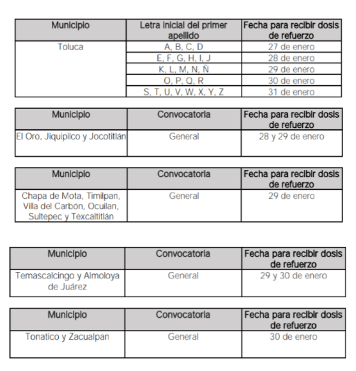 Autoridades de la Secretaria de Salud federal y del Estado de México informaron que a partir de este jueves 27 al 31 de enero se aplicará la vacuna de refuerzo para adultos de 50 a 59 años de edad en 14 municipios mexiquenses.