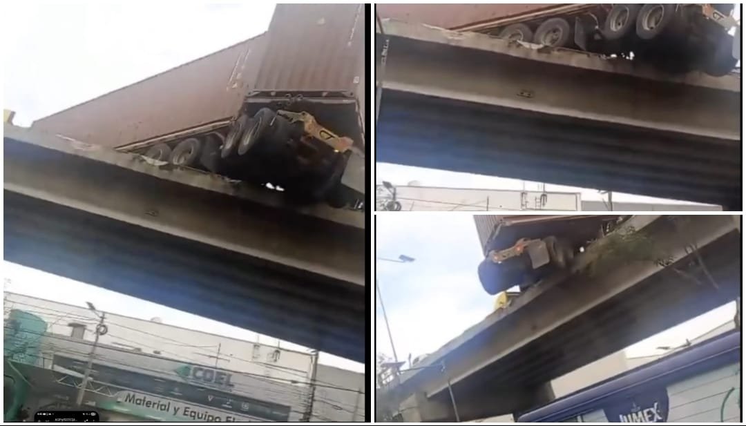El percance ocurrió cuando la pesada unidad perdió el control y su contenedor quedó suspendido, amenazando con desplomarse hacia la vialidad, lo que representó un grave riesgo para peatones y automovilistas que circulaban en el lugar.