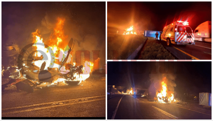 Lamentablemente una persona murió calcinada, luego de que dos tracto camiones chocarán y ardieran en llamas y uno vehículo más de seguridad privada se viera afectado en el paraje Tierras Blanca en el municipio de Atlacomulco.