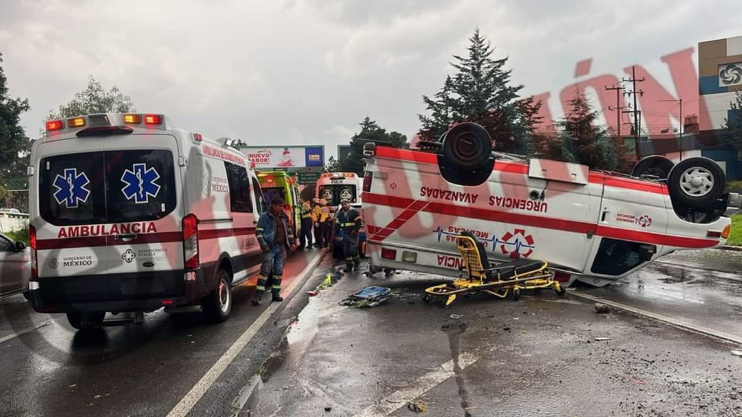 Los reportes indican que este martes, la lluvia registrada esta tarde y el asfalto mojado provocó que la ambulancia quedara con las llantas haciaarriba, luego de que el conductor perdiera el control del volante con dirección hacia la Ciudad de México.