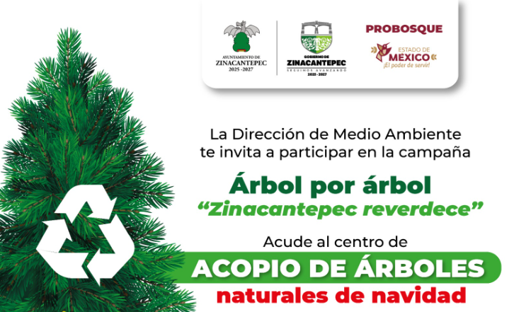 Como parte de la campaña “Árbol por árbol, Zinacantepec reverdece”, los habitantes de Zinacantepec pueden reciclar su árbol de navidad en el vivero que se encuentra en Circuito Vial Acahualco, en un horario de lunes a viernes de 9:00 a 17:00 horas, hasta el 6 de febrero.